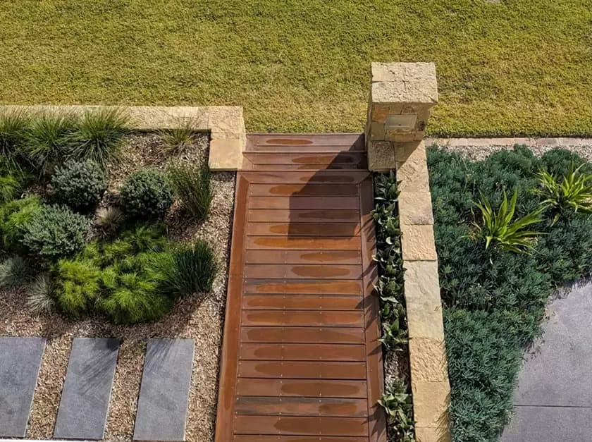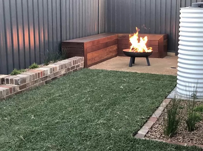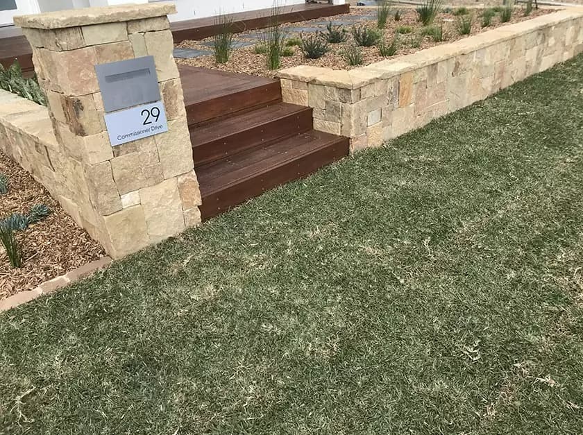 At project willowdale our brief was to compliment a new hamptons style home. The design featured a natural stone cladded retaining wall with encorporated mailbox and also a hardwood timber deck to create an inviting entrance. The rear space includes a recycled brick planter box and a small fire pit area for the family to enjoy. We decided to compliment the stone, brick and timber with low maintenance native style planting.